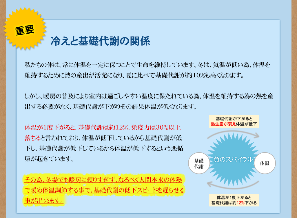 また、体が皮膚表面から熱を逃がす際に、外の温度は一定に保たれている為、汗をかいてしまいます。その汗をそのままにしておくと、水分が蒸発するときに熱が奪われて、逆に身体を冷やしてしまいます。