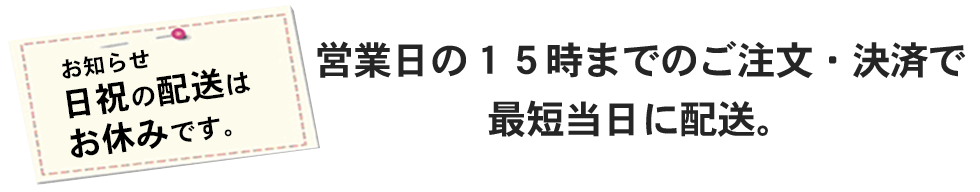 ※土日祝日における倉庫からの出荷作業はお休みとなっておりますので、翌営業日に出荷致します。